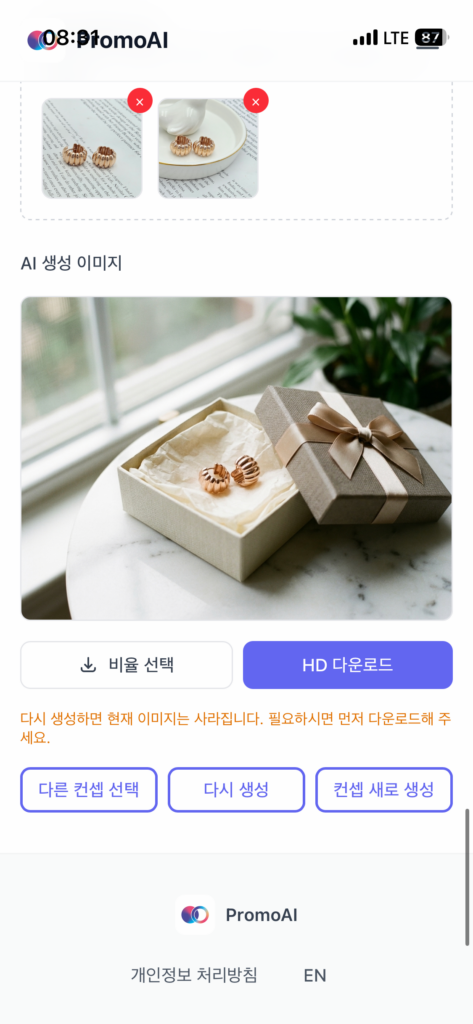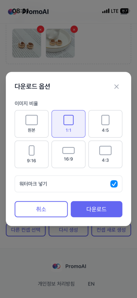 프로필에서 내 워터마크(텍스트 또는 로고 이미지)를 한 번만 등록해두면, 이후 생성되는 모든 홍보 이미지는 다운로드하는 순간 내 브랜드가 찍힌 채로 저장됩니다. 편집 툴을 따로 열 필요가 없고, 저장 후 수정할 필요도 없어요.