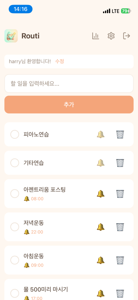 이런 작은 습관들을 가장 스마트하고 귀엽게 관리하기 위해 만든 서비스가 바로 루티(Routi)입니다.